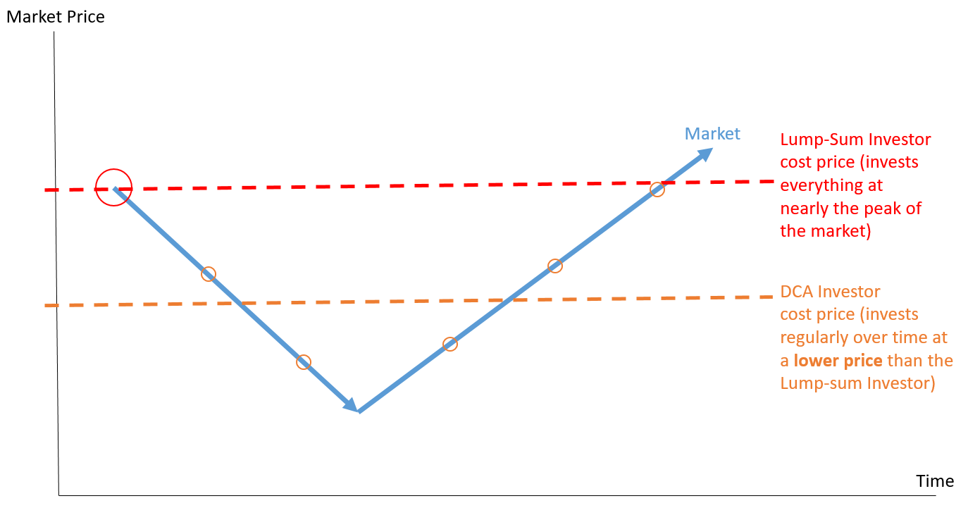 When the market crashes, the person who performs DCA receives a lower price over time and outperforms the lump-sum investor during the recovery.